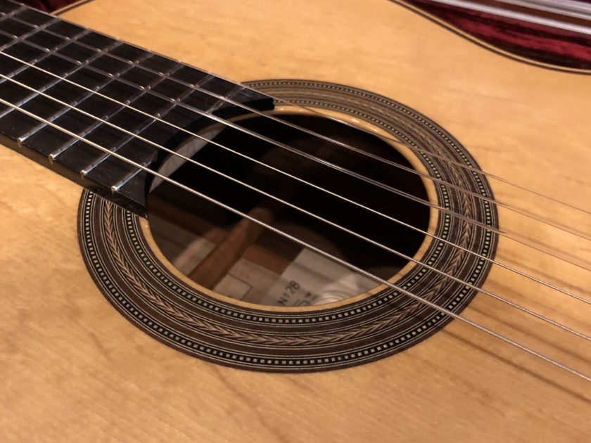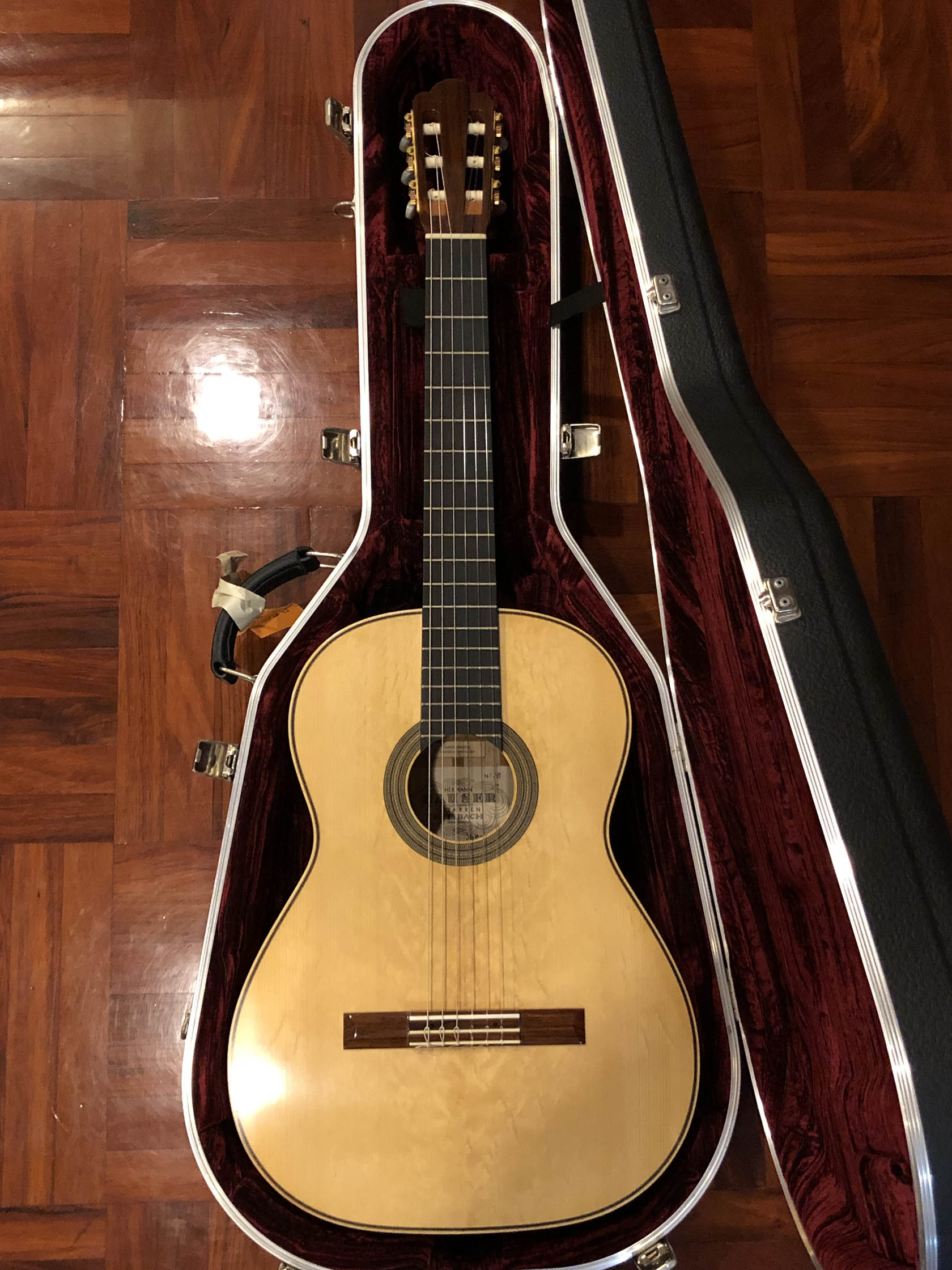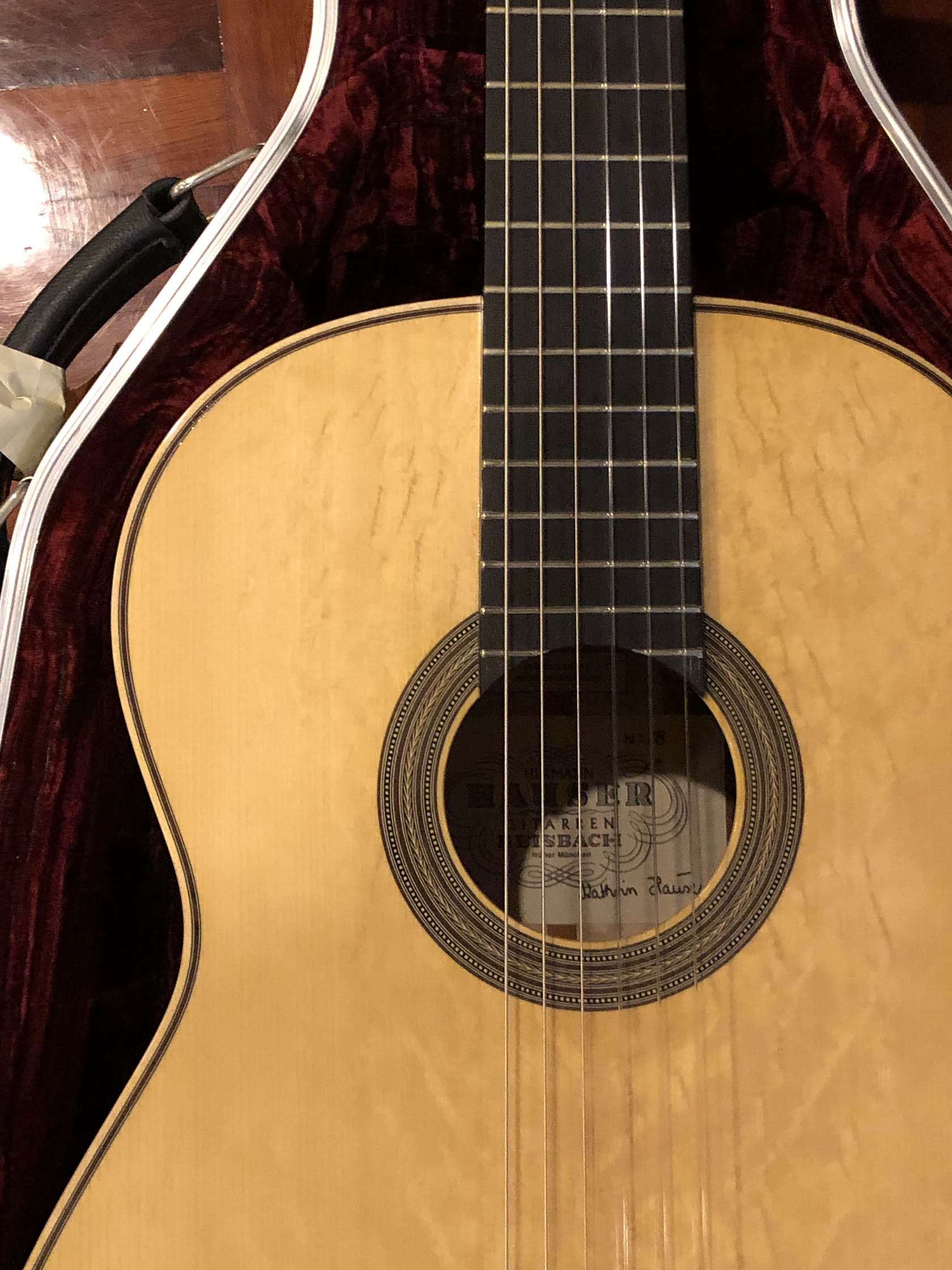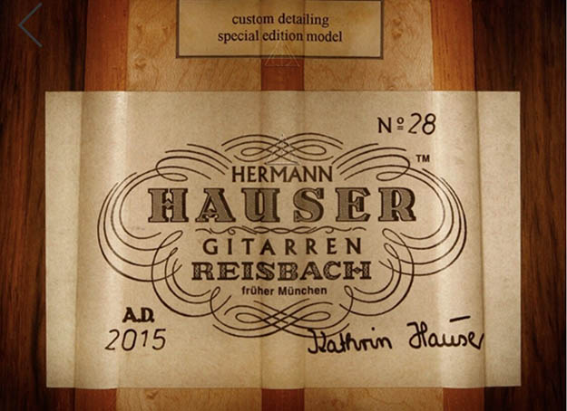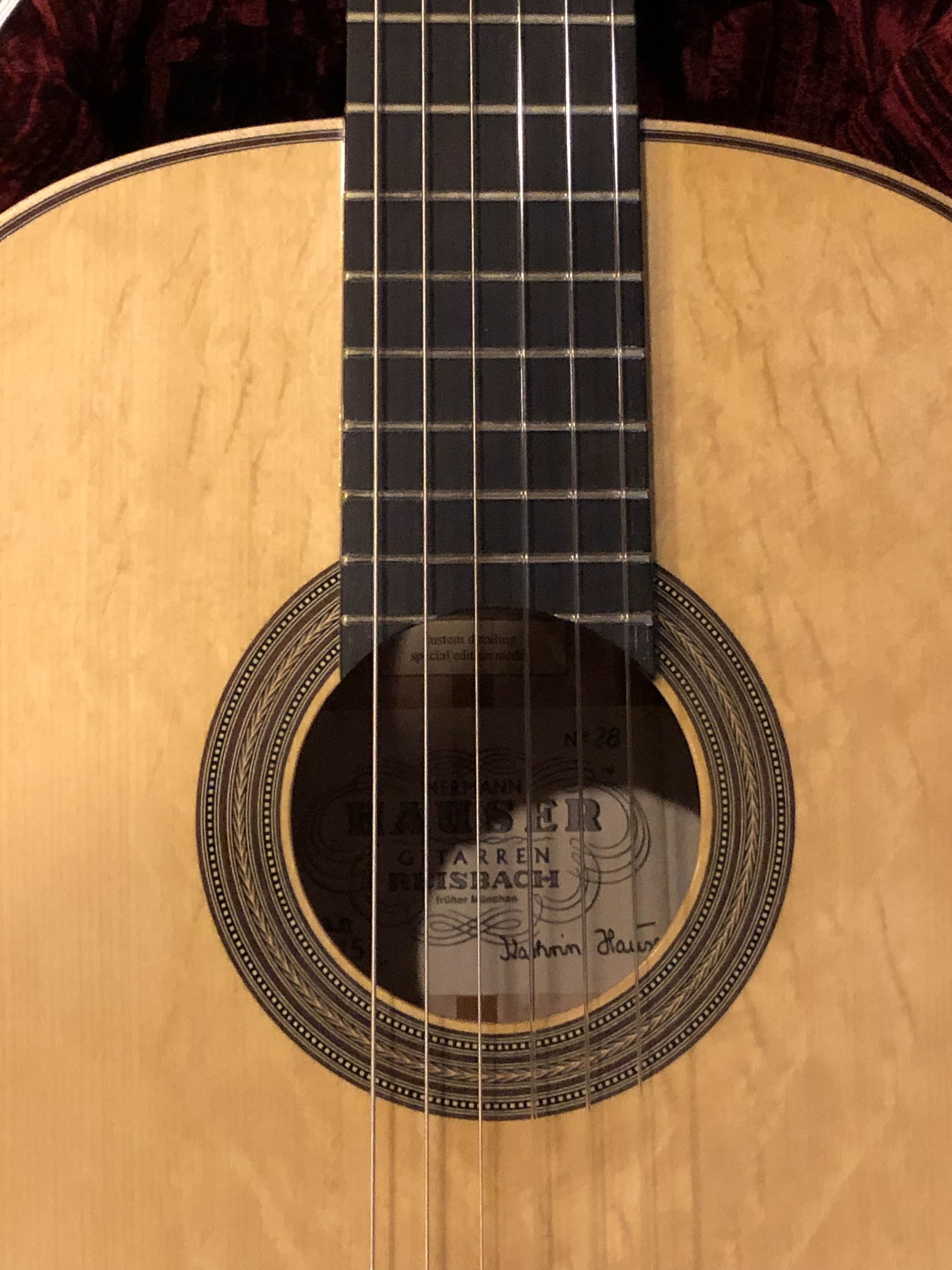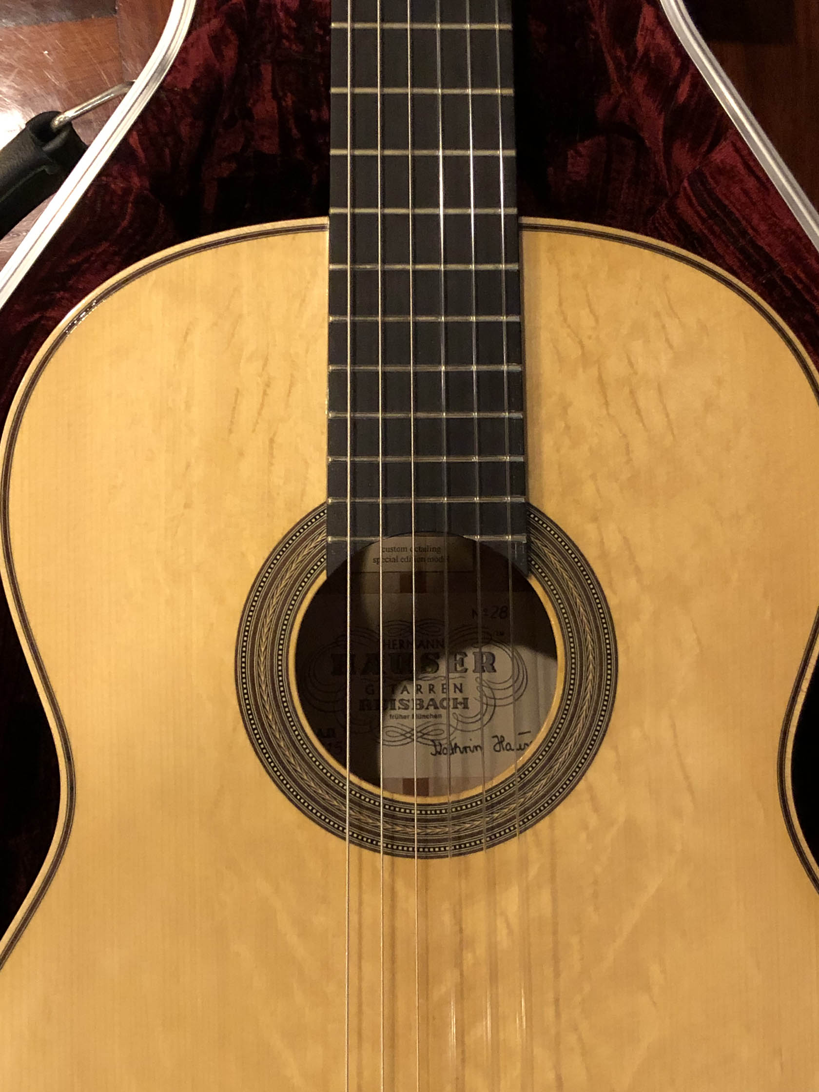Kathrin Hauser (born 1982) is the latest member of a family the choice of concert guitarists for generations. Today Hauser guitars command five figures and are the choice of great guitarists the world over. The Hauser dynasty began in the late 19th century with Joseph Hauser (1854-1939). In 1937, his son, Hermann Hermann I (1882-1852), built a guitar for Segovia who declared it to be “the greatest guitar of our epoch.” Segovia played that guitar the next 25 years, which now resides in the New York’s Metropolitan Museum of Art. Hauser I died in 1952, but not before he taught his son Hauser II (1911–1988), who began working with him in 1926, the subtleties of creating fine concert guitars. Hermann Hauser III (born 1952) likewise learned the fine points of the craft from his father. Under her father’s tutelage Kathrin Hauser began building guitars in 2006. As building a guitar takes between 150 and 240 hours, her out put his only a handful of guitars a year. While to date she has only Sold 33 guitars under her own name which have gone all over the world. As she also continues to assist her father, she has worked on many others. This guitar which her father told me that he thinks is a particular wonderful guitar, and really loves.  It is easy to see why the guitar has a very full-bodied and rich crystalline tone, with truly lovely trebles that sign, supported by full deep bases. The top (which I helped select during a visit to their shop from a stock of woods that have been in the family for generation) is of German spruce with wonder tap tone, and has dramatic bear claw showing that it was perfectly split.