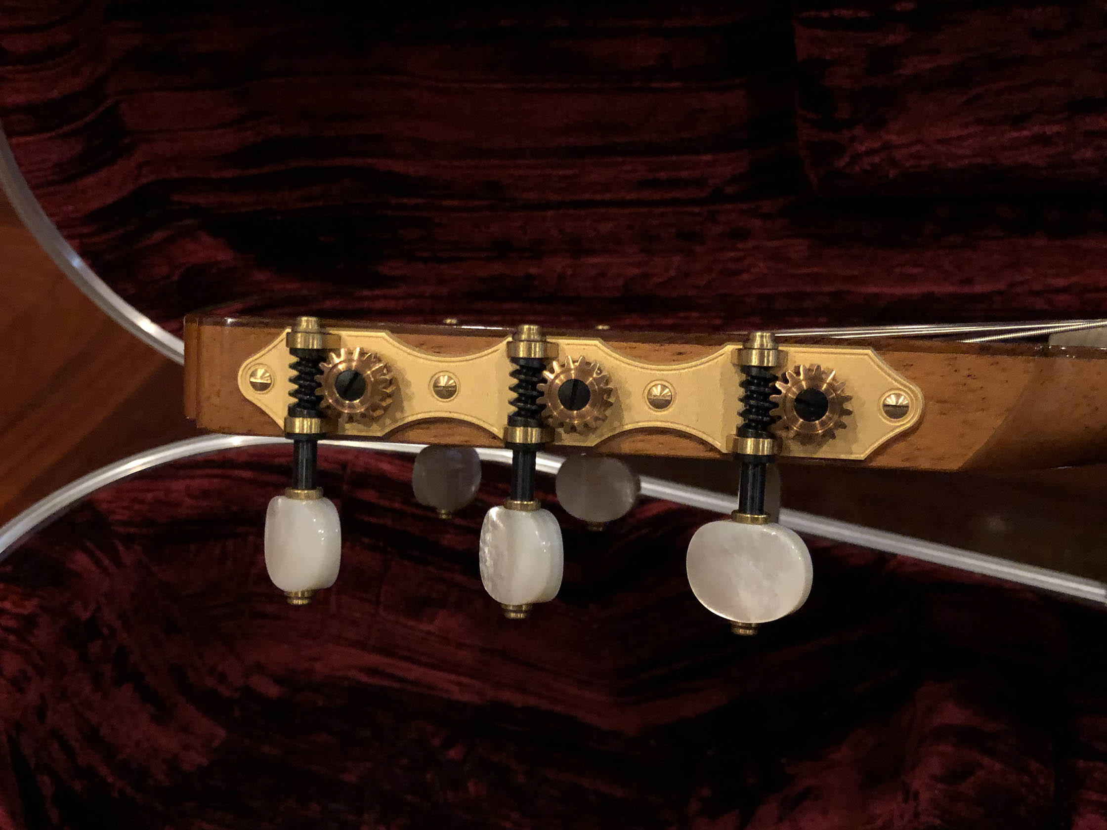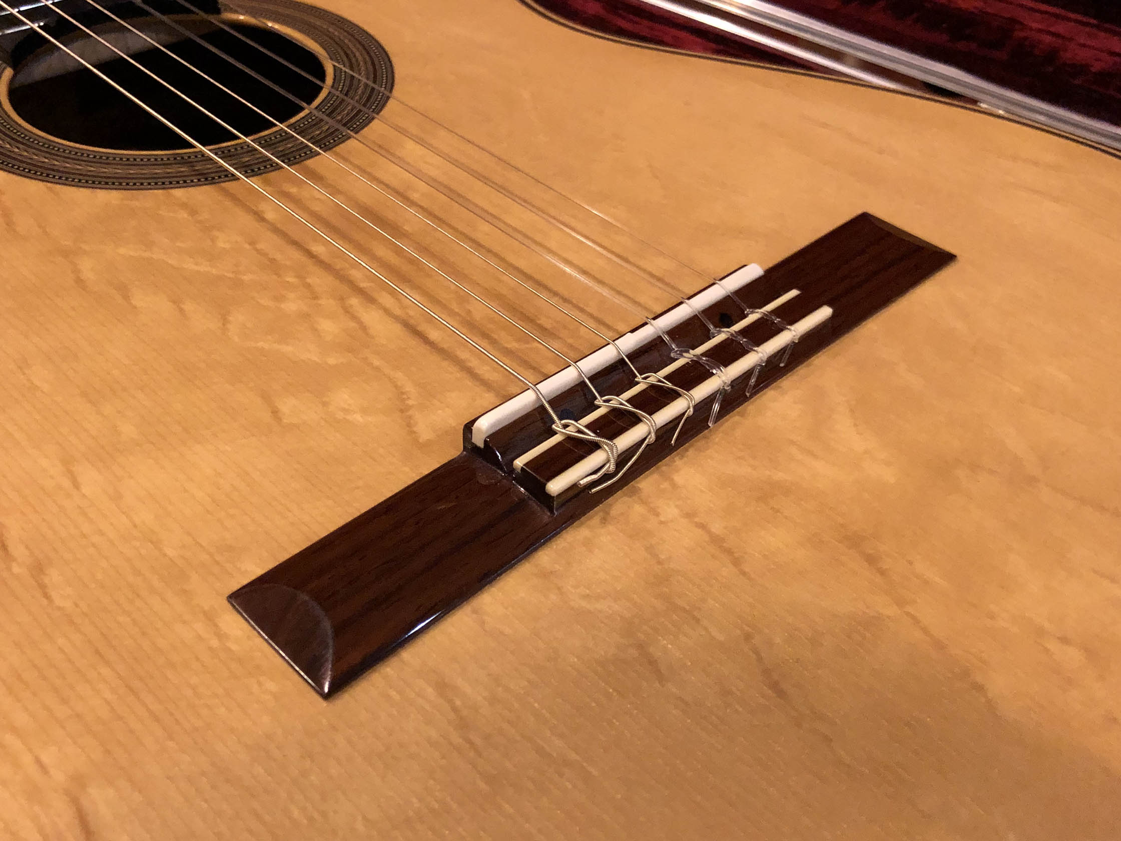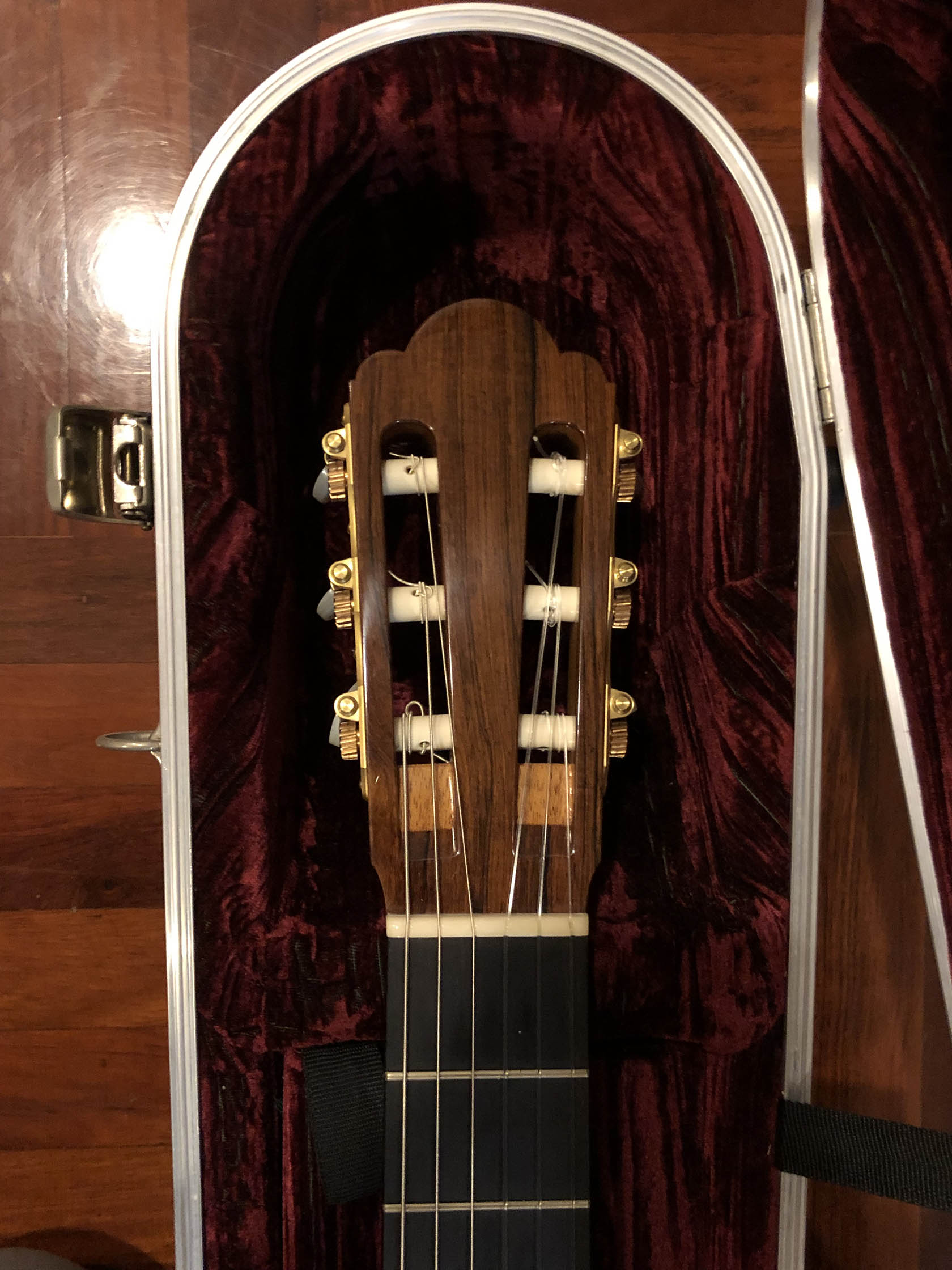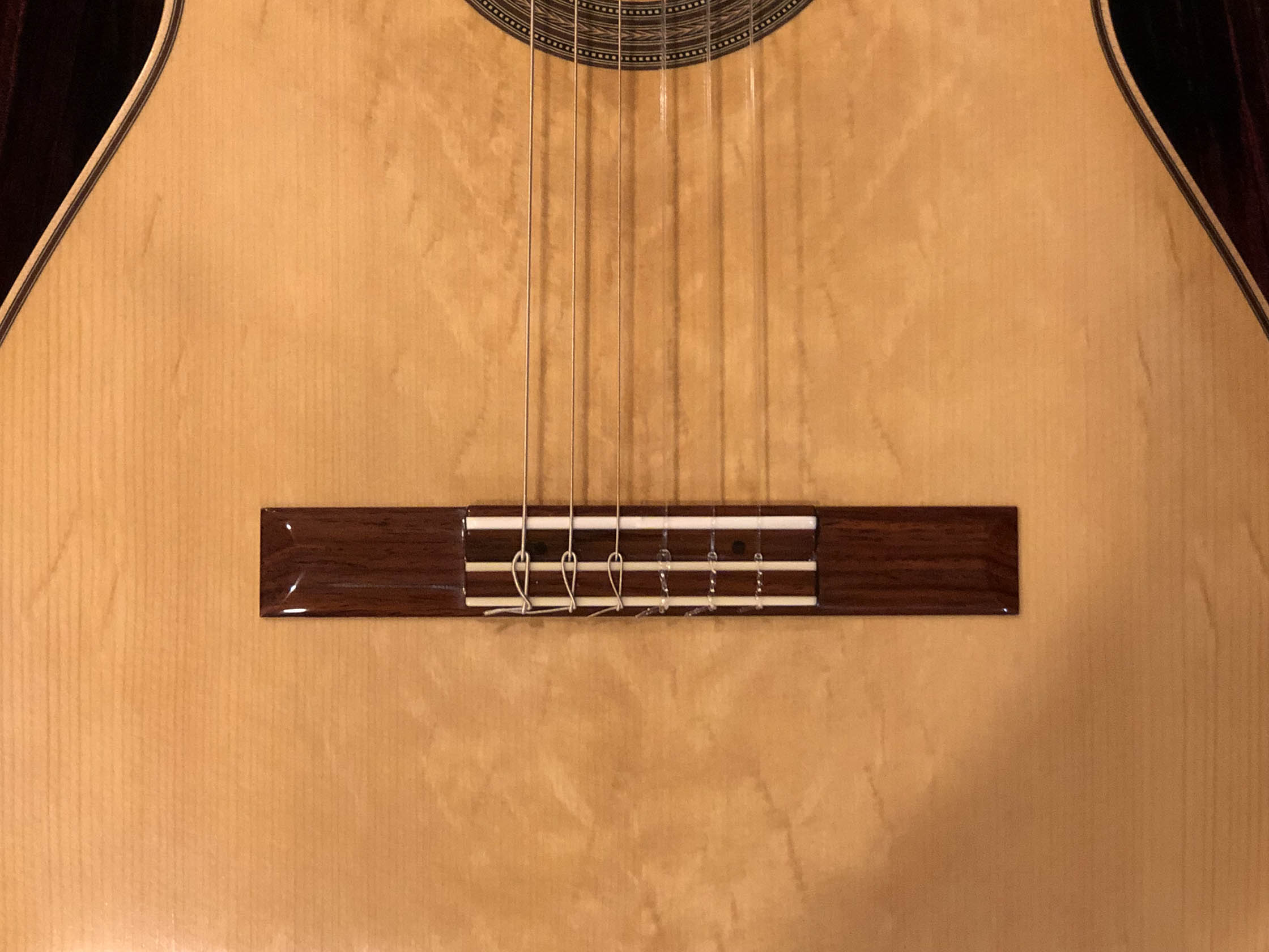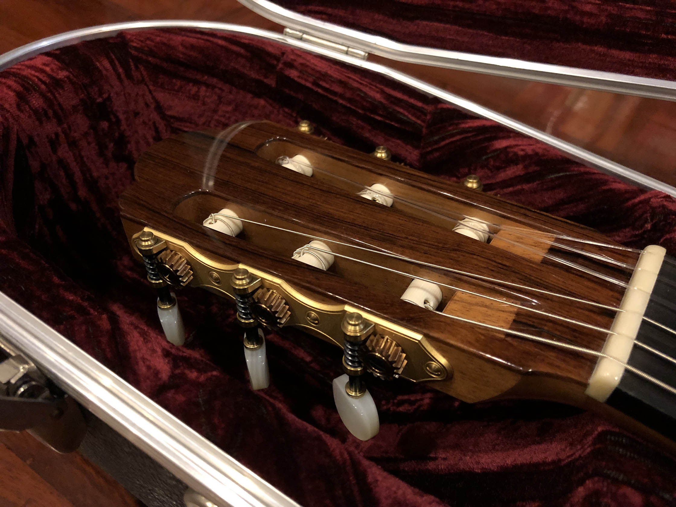 Kathrin Hauser (born 1982) is the latest member of a family the choice of concert guitarists for generations. Today Hauser guitars command five figures and are the choice of great guitarists the world over. The Hauser dynasty began in the late 19th century with Joseph Hauser (1854-1939). In 1937, his son, Hermann Hermann I (1882-1852), built a guitar for Segovia who declared it to be “the greatest guitar of our epoch.” Segovia played that guitar the next 25 years, which now resides in the New York’s Metropolitan Museum of Art. Hauser I died in 1952, but not before he taught his son Hauser II (1911–1988), who began working with him in 1926, the subtleties of creating fine concert guitars. Hermann Hauser III (born 1952) likewise learned the fine points of the craft from his father. Under her father’s tutelage Kathrin Hauser began building guitars in 2006. As building a guitar takes between 150 and 240 hours, her out put his only a handful of guitars a year. While to date she has only Sold 33 guitars under her own name which have gone all over the world. As she also continues to assist her father, she has worked on many others. This guitar which her father told me that he thinks is a particular wonderful guitar, and really loves.  It is easy to see why the guitar has a very full-bodied and rich crystalline tone, with truly lovely trebles that sign, supported by full deep bases. The top (which I helped select during a visit to their shop from a stock of woods that have been in the family for generation) is of German spruce with wonder tap tone, and has dramatic bear claw showing that it was perfectly split.